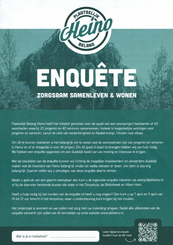 Maakt u gebruik van een geprint exemplaar dan kunt u de ingevulde enquête inleveren via welzijn@pbheino.nl of bij de daarvoor bestemde bussen die staan in het Dorpshuis, de Bibliotheek en Albert Heijn.