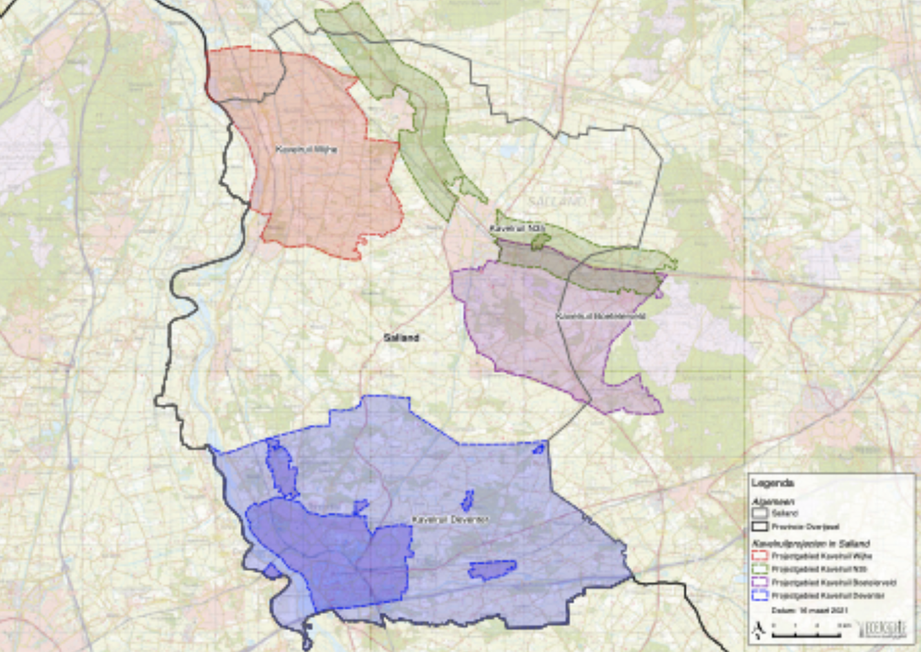 ‘Kavelruil Salland’ is de titel waaronder de kavelruil in heel Salland verder gaat. Agrarische ondernemers en andere grondeigenaren in de gemeenten Raalte, Olst-Wijhe en Deventer, kunnen hier terecht voor het ruilen van (landbouw)grond. Deze aanpak brengt kavels dichter bij huis en dichter bij elkaar. Dat bespaart veel tijd en kosten en is duurzamer en verkeersveiliger. Ook kunnen de koploperprojecten in Salland ondersteuning krijgen op het grondspoor. Ruiling van percelen kan helpen bij het realiseren van natuur en wateropgaven.