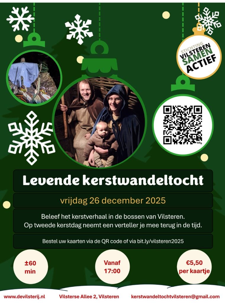 Ook dit jaar kan er op tweede kerstdag, bij het invallen van de avond in de bossen van Vilsteren weer, onder begeleiding van een verteller, een wandeling gemaakt worden door het kerstverhaal. U ontmoet de herders, maar ook Romeinen, een engel, drie koningen komt u onderweg tegen en uiteindelijk zult u Jozef, Maria en het kindje Jezus aantreffen in een stalletje.