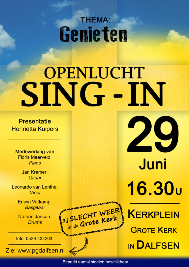DALFSEN – Op zondagmiddag 29 juni zal er om 16.30 uur een openlucht Sing-in gehouden worden op het Kerkplein bij…